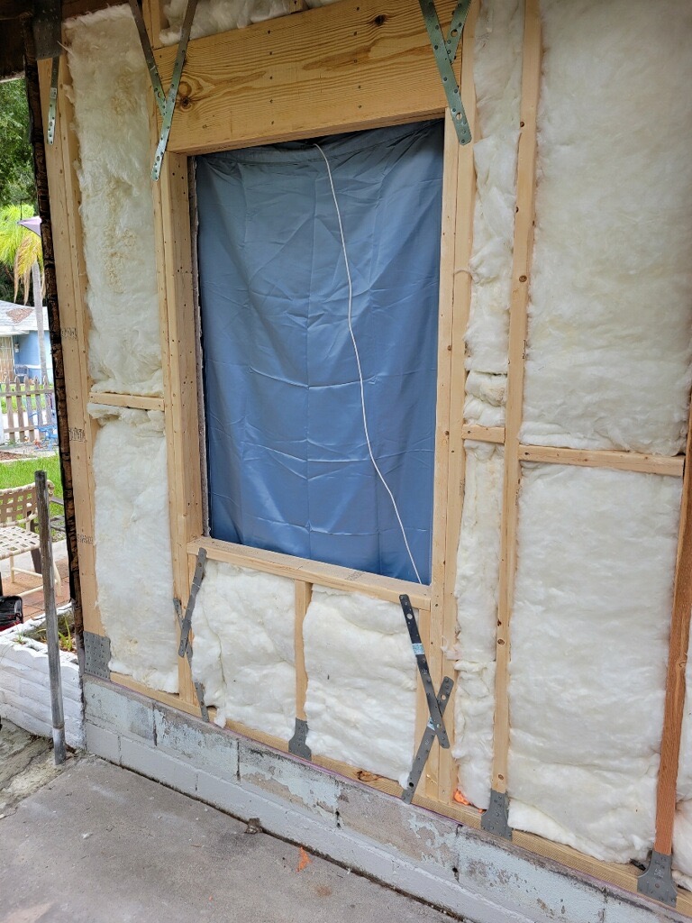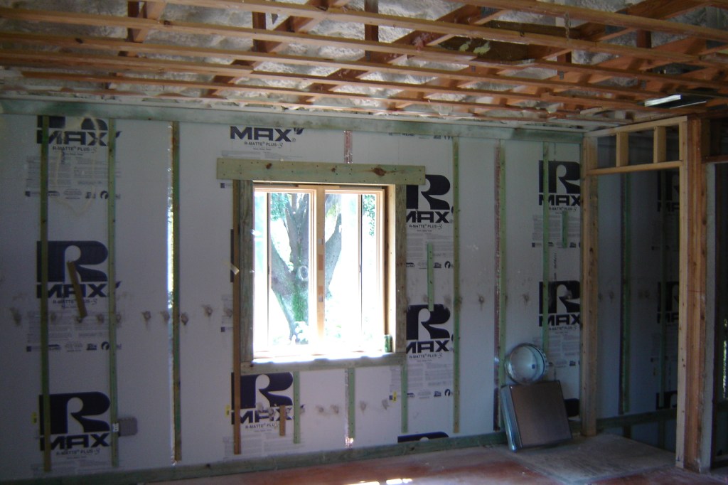 This 1950s home has new fiberglass batt insulation in its walls when extensive termite damage required replacing the wood siding, sheathing (plywood), and some of the wall framing. Note that hurricane straps were added and the windows were also replaced, but the plaster inside was not touched. (Project #21-03)