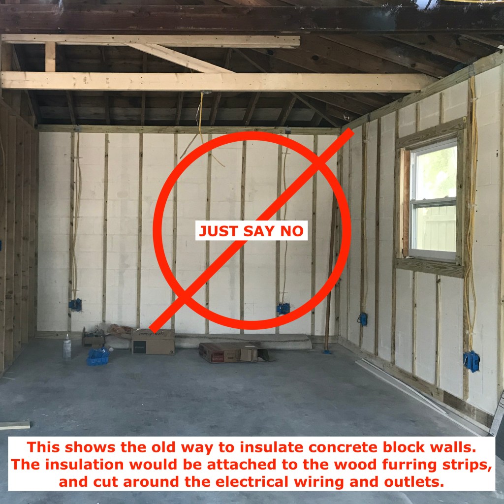 Concrete block walls properly and continuously insulated with rigid insulation board glued directly to the block. Wood furring strips on top of them allow drywall and electrical wiring to be attached. (Project #09-09)