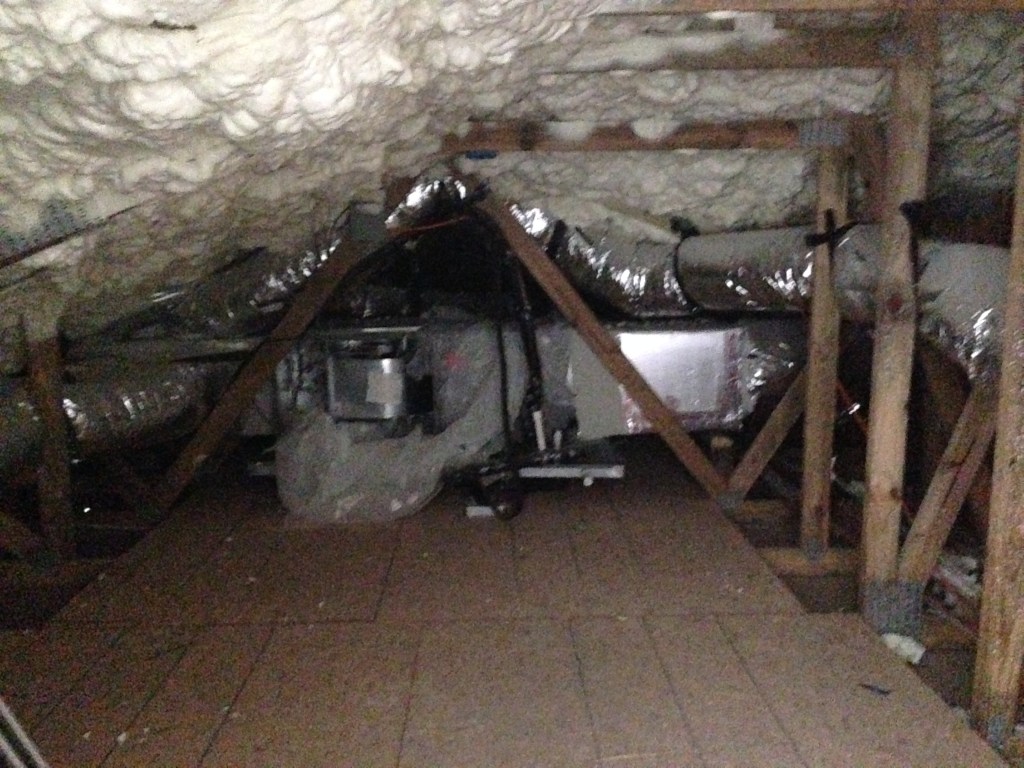 A slightly blurry photo showing an attic with ductwork inside and sprayfoam insulation on the underside of the roof. (Project #14-12)