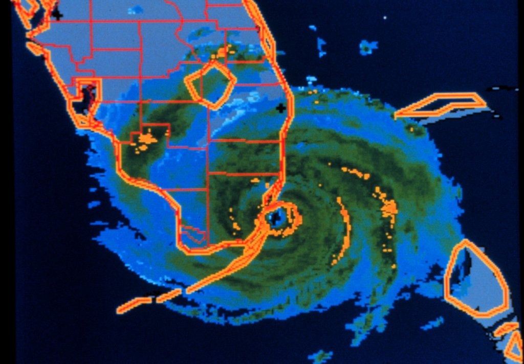 Hurricane Andrew – WSI radar composite of Andrew making landfall August 24, 1992, at Dade County, Florida – Photo and caption courtesy of NOAA