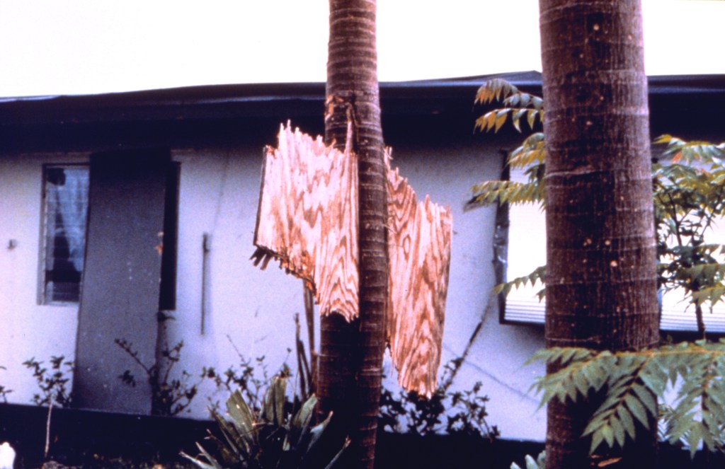 Hurricane Andrew – A piece of plywood driven through the trunk of a royal palm – Photo and caption courtesy of NOAA