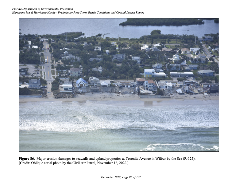 According to the Florida Department of Environmental Protection’s report Hurricane Ian & Hurricane Nicole – Preliminary Post-Storm Beach Conditions and Coastal Impact Report, published December 2022, both Vero Beach and Wilbur-by-the-Sea had the same degree of beach and dune erosion damage, Category IV, the highest degree of erosion. However, Wilbur-by-the-Sea has almost no dunes protecting it, while Vero Beach has a lot of dunes.