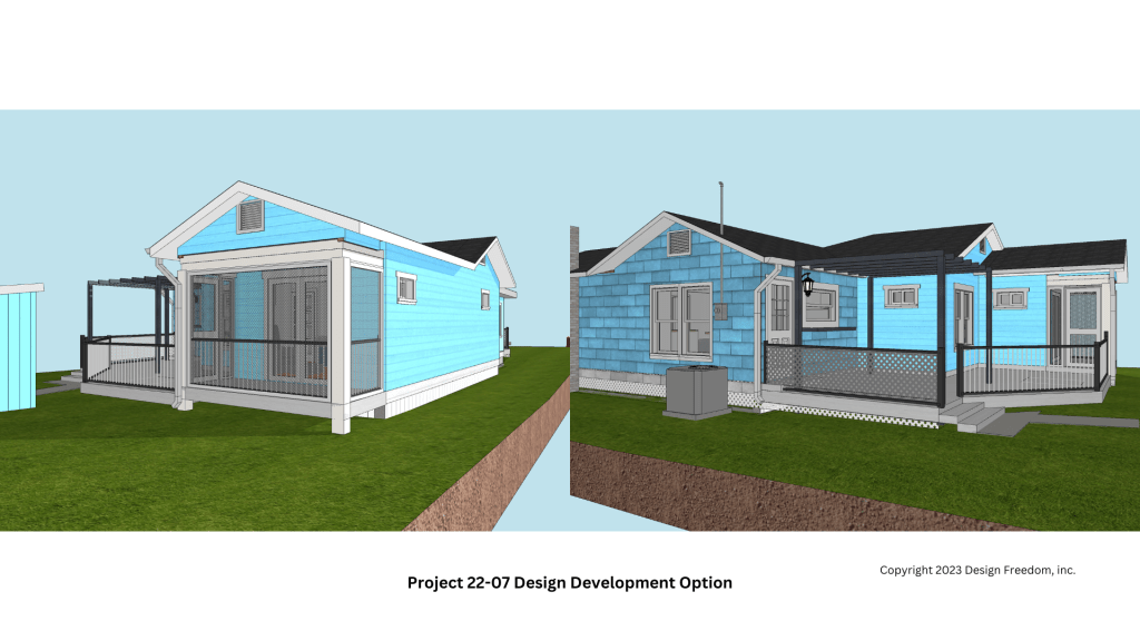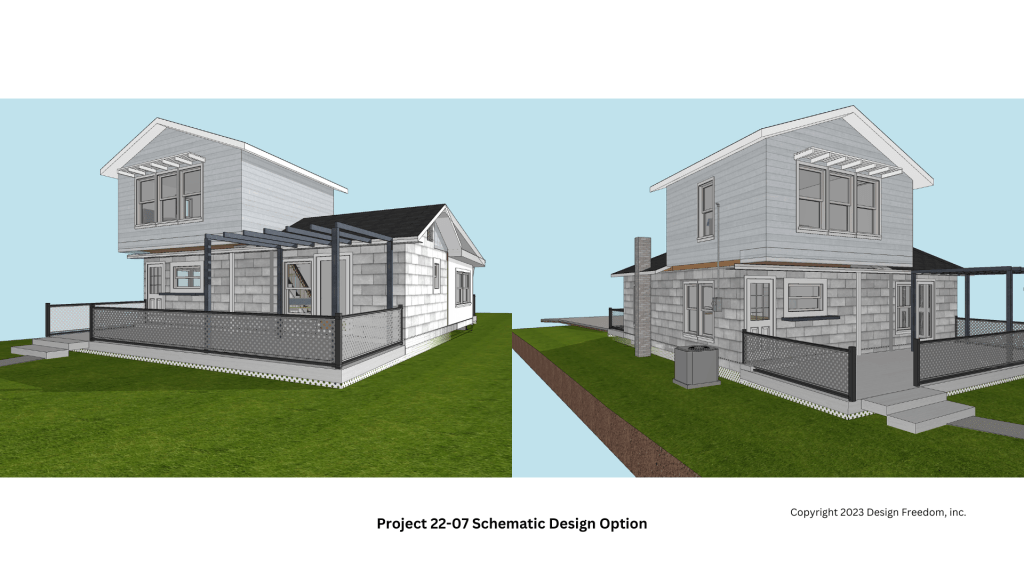 Following the 3D images of the small house in this article, we can see the progression of the design. The existing house has a large deck with several rooms overlooking it. The design moves forward with 2 options in Schematic Design: the upstairs addition option, and the first floor addition option. Although the Clients thought they wanted the upstairs addition, which would keep the large deck, both cost and accessibility were weighed, and the first floor addition was chosen. When that decision was made, there were more options to consider, including adding a small screen porch, or preferring windows instead of doors from that room. The Clients originally wanted to re-use the old pergola in the new design, but eventually we added a small roof over part of the deck instead. In the final rendering, there is a small pop-out on the deck for the BBQ grill, so the Clients don’t have to figure out where to put it later. There were more variations along the way, but in the end, this is the iterative path that this Addition Remodel took.
