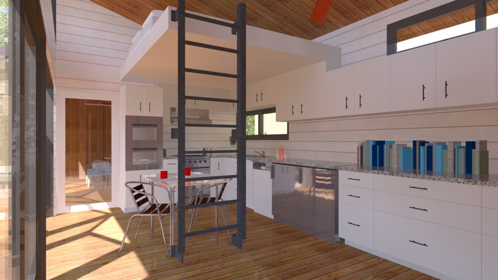 The house features a separate bedroom, with extra beds for guests. A loft above the kitchen is accessed via a ladder next to the island, and there’s a Murphy bed in the living room closet. The bedroom also has a Murphy bed that can fold up, transforming the room into a home office or additional entertainment space during parties.