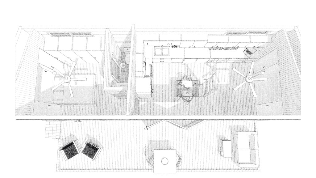 This home was initially designed for a rented lot in a mobile home park in Pinellas County, FL, though the client planned to move it to a nearby property later on. The parking area is on the south side, with the house on the lot’s north side. A unique feature is the deck, which can fold up against the house when not in use, providing security by covering the large glass doors. The deck is divided into two parts, allowing access to the door even when the larger section is folded up.