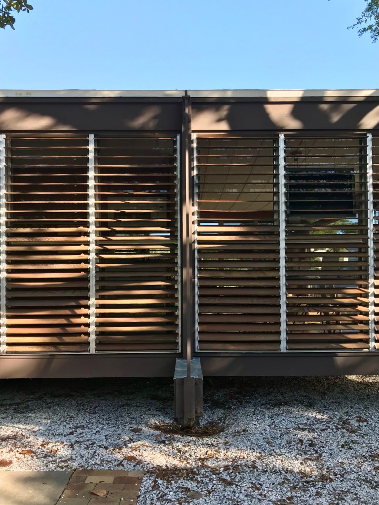Concrete and block made from Florida’s sand and limestone were celebrated for their durability and simplicity. Because most homes didn’t yet have air conditioning, designers relied on cross-ventilation, Ocala block screens, and jalousie windows (adjustable glass louvers) to let in breezes while keeping out rain. Adjustable awnings and shade panels became both functional and playful design elements.